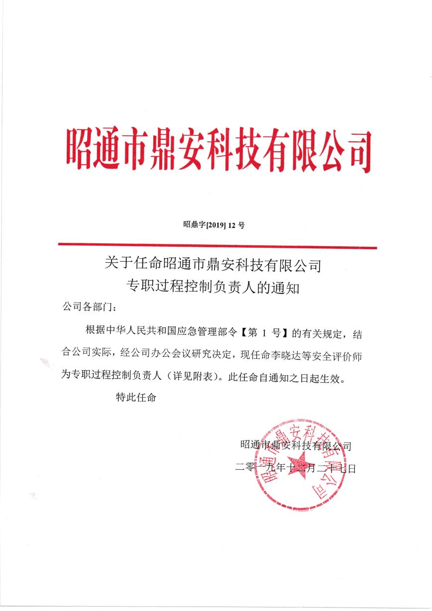 關(guān)于昭通市鼎安科技有限公司專職過(guò)程控制負(fù)責(zé)人的通知